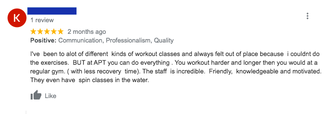 The APT program is revolutionizing aquatic training with our unique programming, specialized equipment, and life-changing results our clients are experiencing. We are offering two different programs at our Monroe location Private Training or Large Group Training. We use advanced strength equipment in the pool such as aquatic treadmills, aquatic cycling bikes, and drag resistance strength training equipment that has multiple levels of resistance to safely challenge our clients in their own way. Typical pool standards use noodles, foam dumbbells, and kick boards which is a very ineffective means of training. Our equipment is proven to deliver results and our clients love the difference they feel compared to traditional pool equipment. Read More